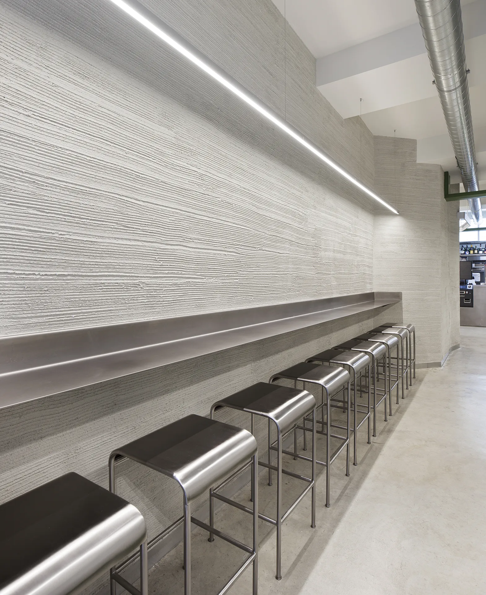 La fachada anticipa la materialidad que encontraremos dentro: tramex metálico, acero inoxidable e instalaciones vistas. Se compone de una doble piel. El primer plano se pliega y se abre a la calle; el retranqueo del segundo hacia el interior genera un umbral, una pequeña terraza que ya sirve como primer punto de encuentro y consigue que el local se abra a la ciudad.