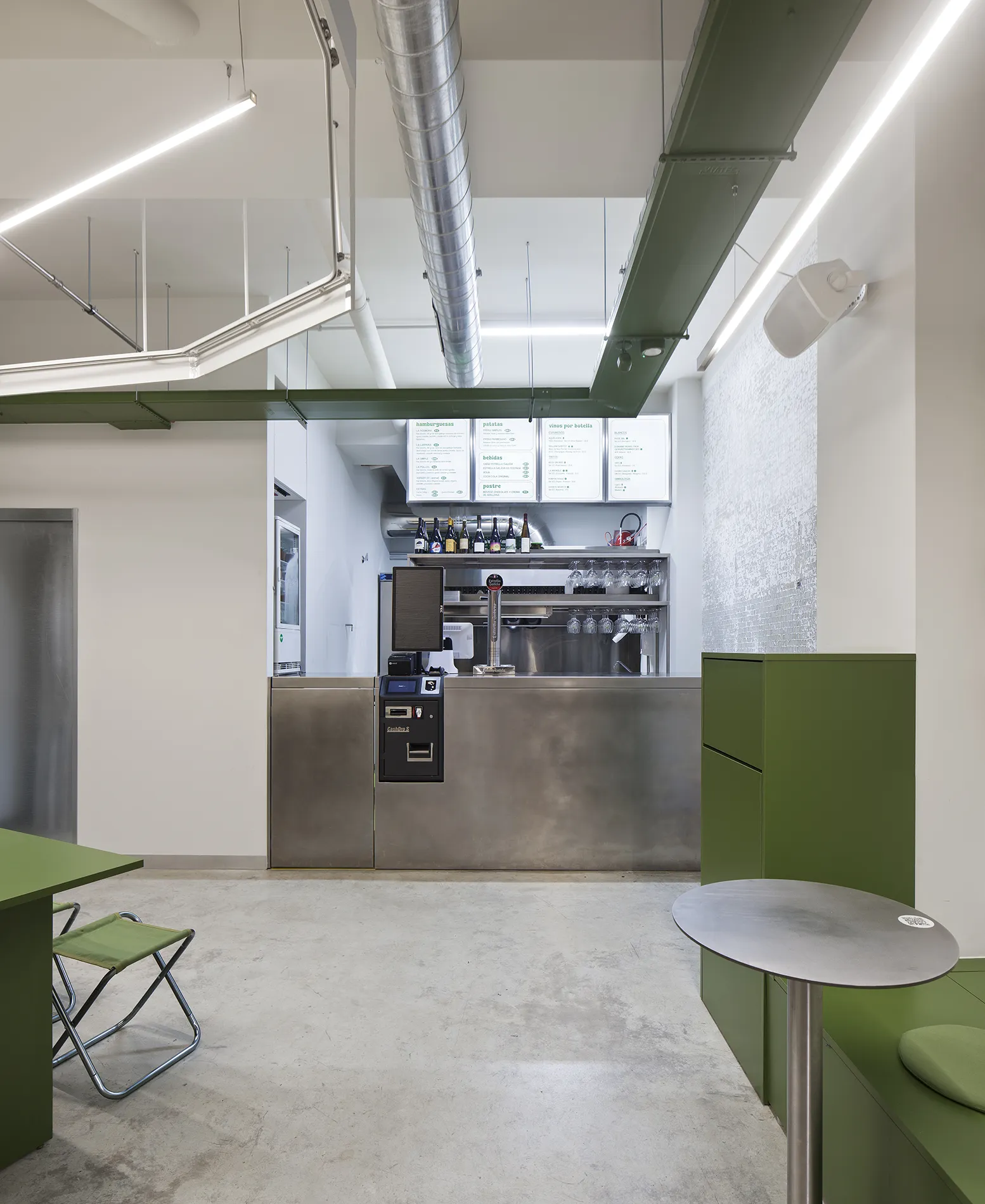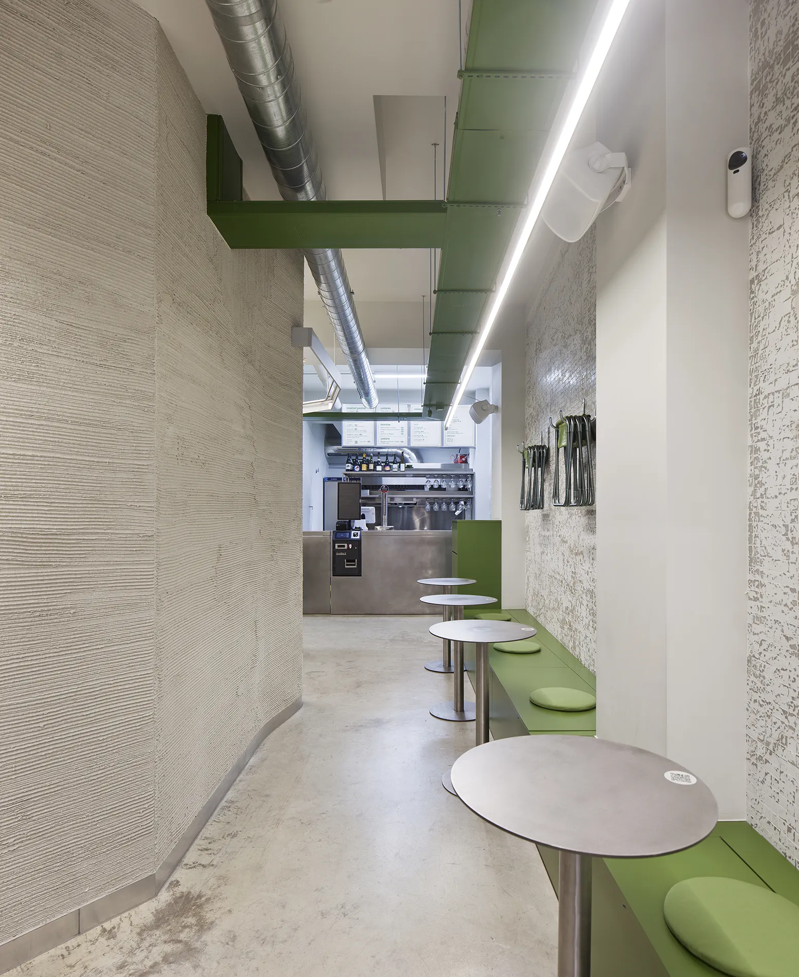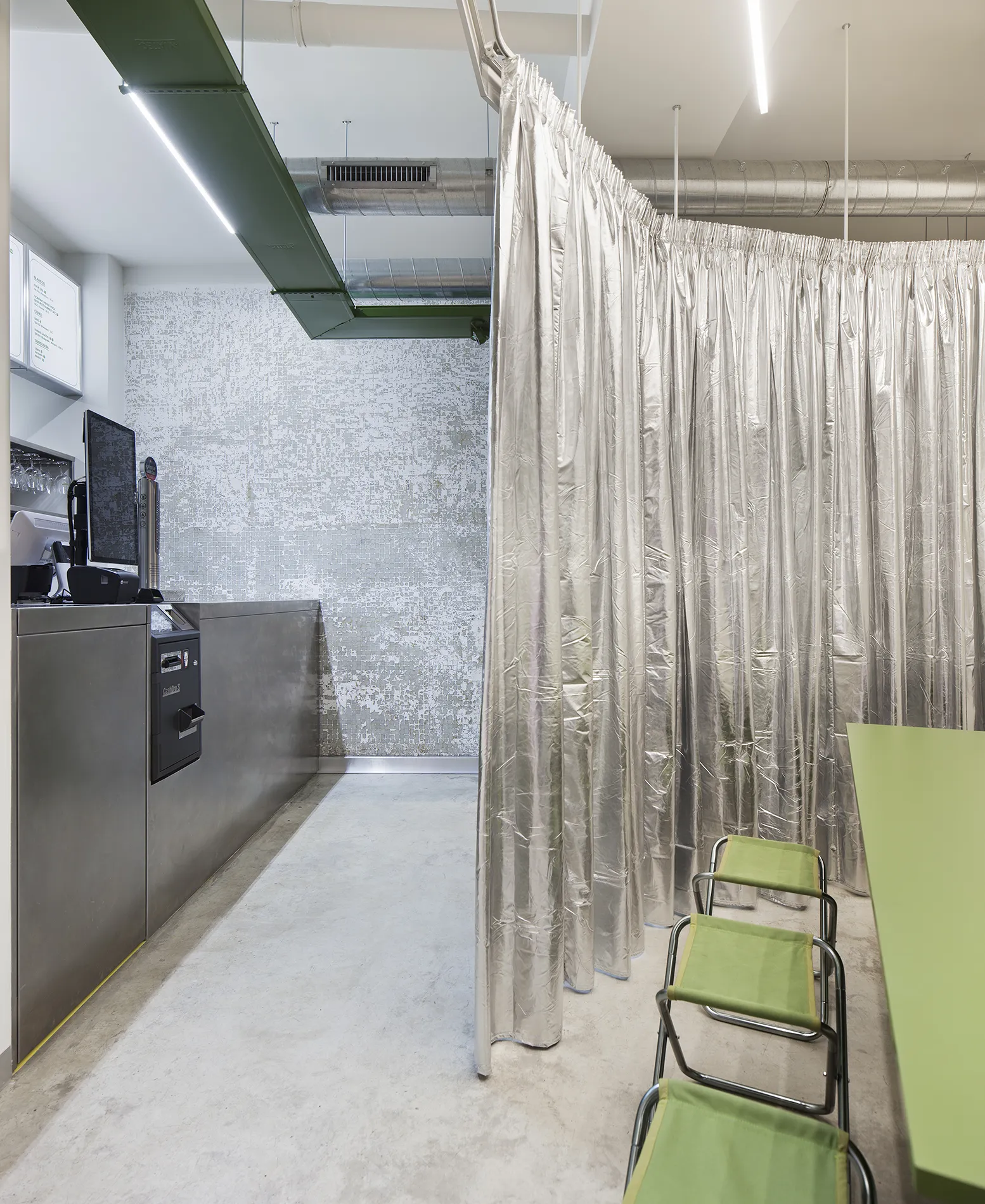 En cada una de las paredes perimetrales se dibuja una zona de consumo: la primera acompaña con su forma curva el recorrido y en ella, una barra alta invita al consumo rápido. En la otra pared, una bancada verde aporta el acento de color y permite un uso flexible de mesas y sillas, acentuado por unos taburetes de cámping colgados en la pared que replican en el interior el uso del espacio público. Al fondo, la cocina y a su izquierda, una sala privada separada por una cortina metalizada que moldea el ambiente, abriéndose o cerrándose según la intimidad requerida.